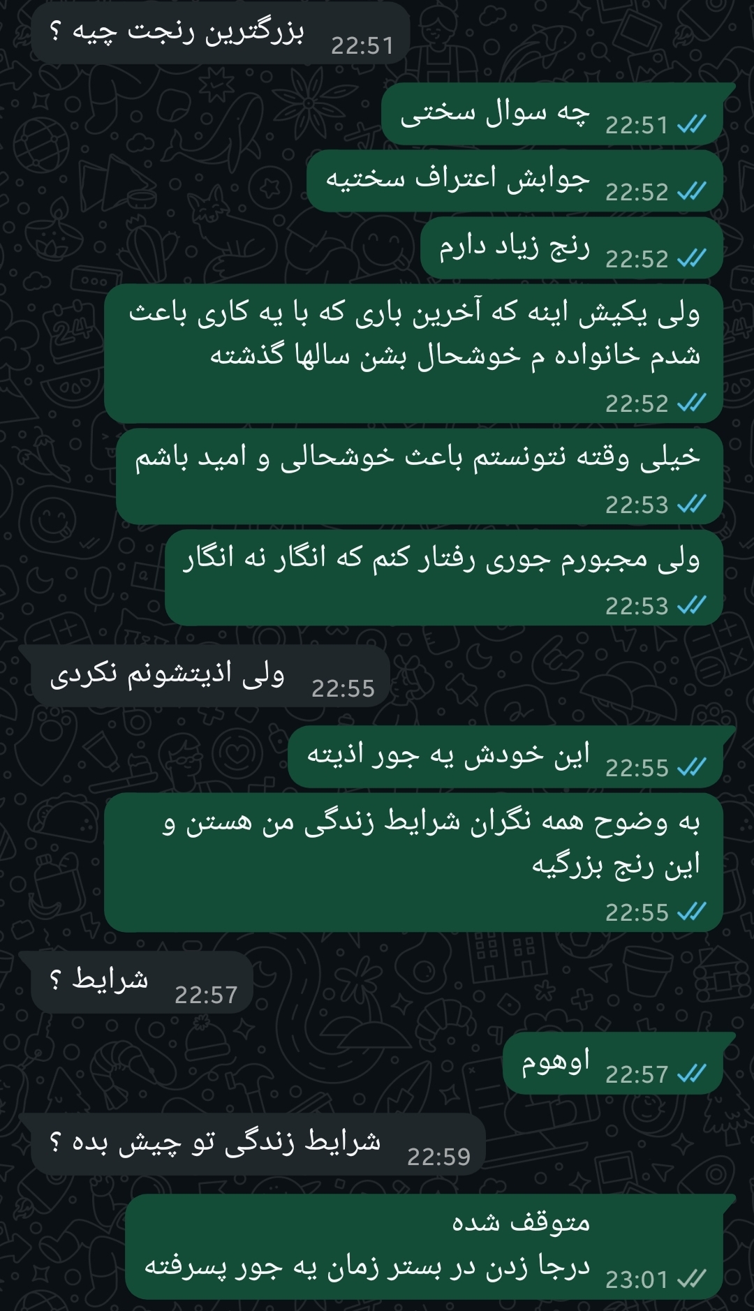 روز هفتم تا امروز هم مریض بودم و تا دیروز عصر از جام نمیتونستم تکون بخورم